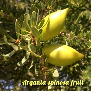 baies contenant un noyau renfermant une graine appelée "amande" de laquelle on tire par pressage l'huile d'argan urilisée en alimentation ainsi qu'en produits cosmétiques et autres savons.