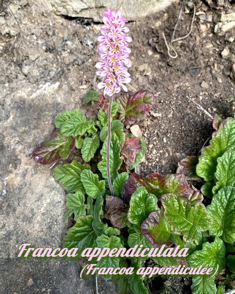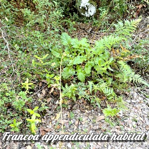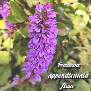 La Francoa appendiculée est une plante herbacée vivace à feillage persistant luxuriant d'une hauteur d'une soixantaine de centimètres, hampe fleurie comprise, pouvant atteindre environ 1 mètre.