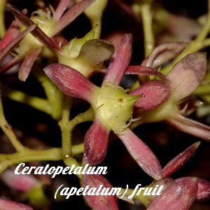 Ceratopetalum gummiferum qui est le plus souvent un arbuste, à feuillage persistant, hauts de 4/5 mètres à 15/25 mètres.