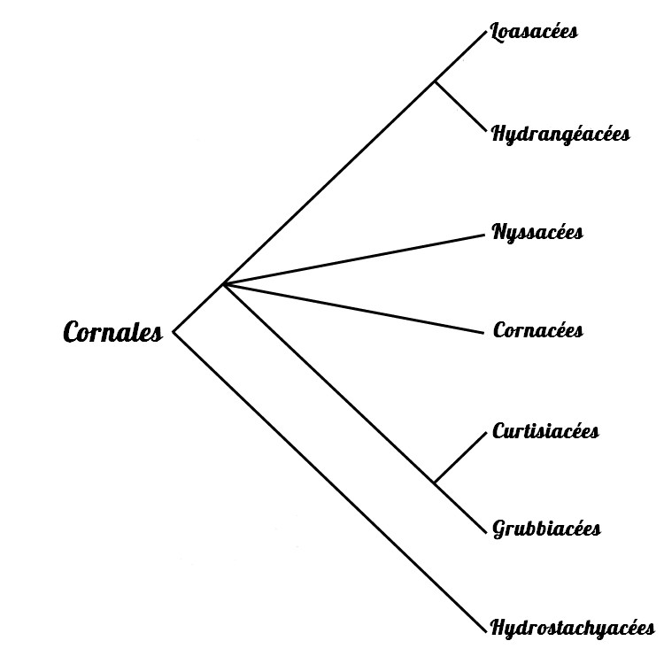 angiospermes dicotylédones réparties dans 51 genres et 7 familles: les Cornacées, les Curtisiacées, les Grubbiacées, les Hydrangéacées, les Hydrostachyacées, les Losacées et les Nyssacées.