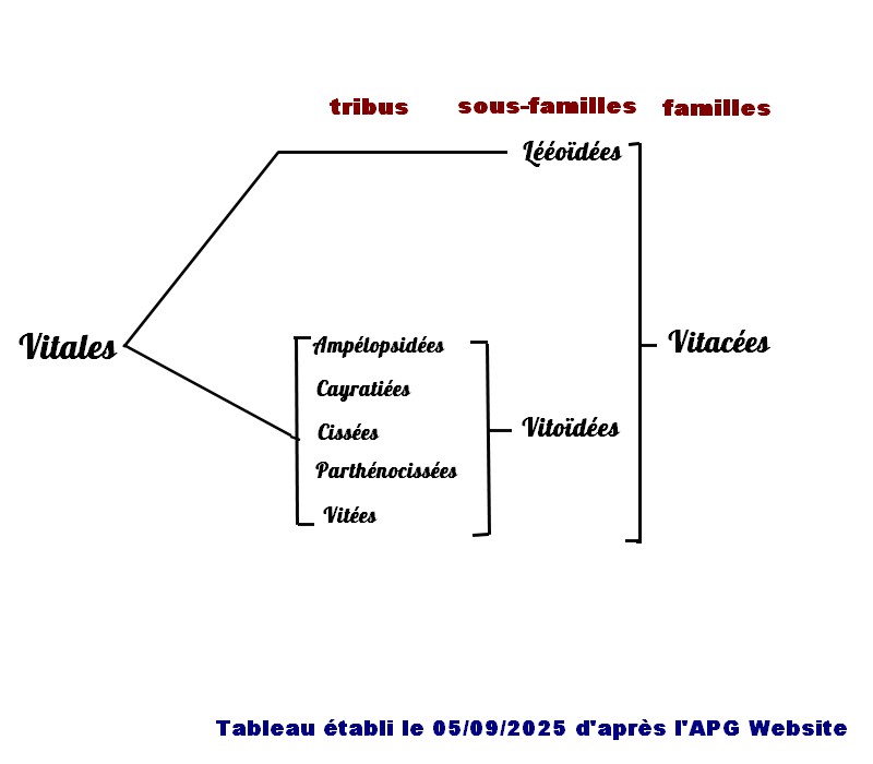 angiospermes dicotylédones réparties dans 17 genres, 5 tribus, 2 sous-familles et une seule familles, les Vitacées.