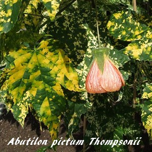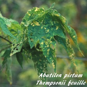 Du fait de la présence d'un virus, l'Abutilon pictum Thompsonii a des feuilles vertes marbrées de jaune.
