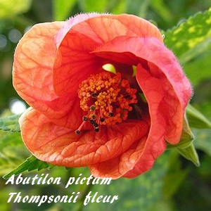 Axillaires, leur port est retombant. Elles sont de couleur saumonée et veinées de cramoisi (les autres cultivars de l'Abutilon pictum ont des fleurs jaunes ou rouges).