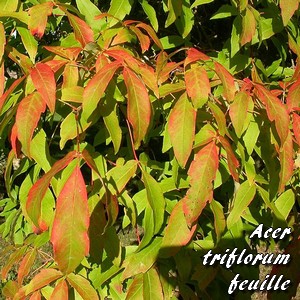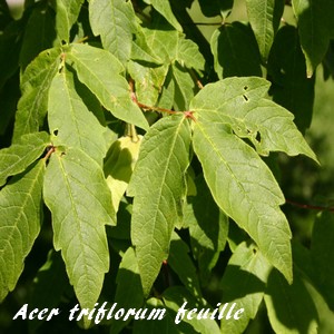Ses feuilles, peu courantes dans le genre Acer, présentent 3 folioles dont le contour a 1 à 3 grandes dents.