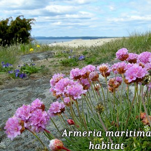 Elle porte les noms vernaculaires de "Gazon d'Espagne" et "Oeillet maritime". Son habitat, comme son nom l'indique, est essentiellement marin, notamment les les plages ou les falaises côtières, mais elle prolifère également dans les prairies sèches et sablonneuses.