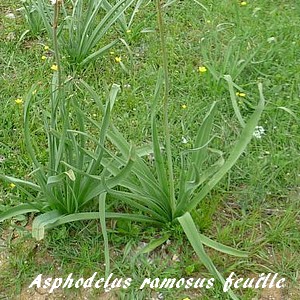 A partir de ses tubercules, l'Asphodèle rameux émet une rosette de feuilles radicales linéaires disposées de façon spiralée. Larges de 2 à 4 centimètres, ces feuilles forment des gouttières.