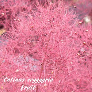 Ses fruits sont de minuscules baies brun brillant enchevêtrées dans les infrutescences formées, en plus des graines, par les pédicelles colorés des fleurs stériles devenus plumeux, ce qui, de loin, donne un air chevelu et vaporeux à l'arbuste.