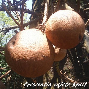 Le Crescentia cujete est un arbre à feuillage caduc, au tronc court, haut de 5 à 10 mètres.