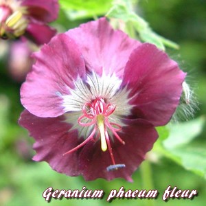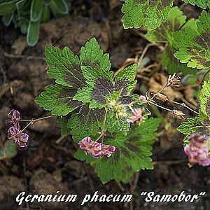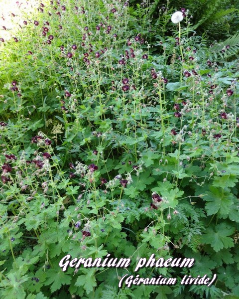 Geranium phaeum "Samobor" à feuilles maculées de brun, ou d'autres à fleurs blanches, roses, pourpres ou lilas.