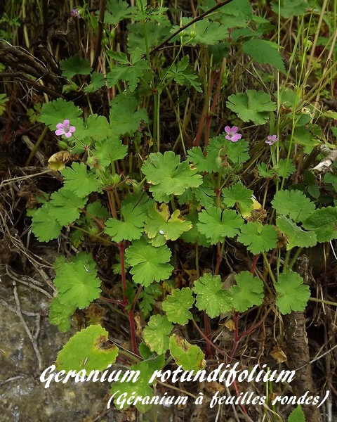 Le Géranium à feuilles rondes est une plante herbacée annuelle, quelquefois bisannuelle, haute de 10 à 40 centimètres, couverte de poils glanduleux plus ou moins perpendiculaires qui dégagent une odeur forte plutôt désagréable au toucher.