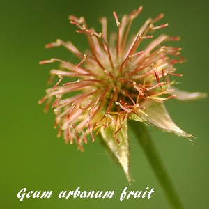 Les fruits de la Benoîte commune sont des akènes munis de petits crochets qui participent à la dissémination de la graine (transportées dans le pelage des animaux par exemple).