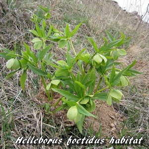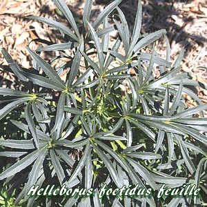Sa tige herbacée robuste et ses feuilles vert foncé sont glabres et coriaces. L'Hellébore fétide ne présente pas de feuilles
