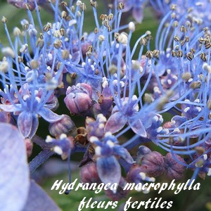 corymbes blancs, roses, mauves, rouges ou bleues, la couleur variant selon le PH du sol et sa teneur en ions d'alumine.