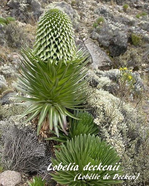 sous-famille des Lobélioïdées) originaire de l'est de l'Afrique où elle pousse entre 2000 et 4000 mètres d'altitude dans les zones humides des landes ou des fonds de vallées des montagnes telles que le Kilimandjaro où elle est la seule lobélie "alpine".