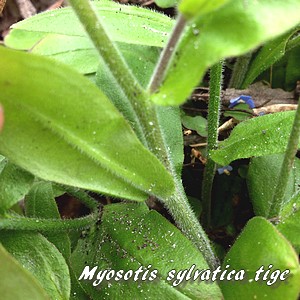 rhizome court, le Myosotis des bois présente des tiges dressées ramifiées, épaisses, raides et velues ainsi qu'une rosette de feuilles