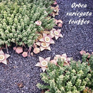 Stapelia variegata pour avoir appartenu à ce genre juqu'en 1975, ainsi que classée dans la famille des Asclépiadacées (famille aujourd'hui invalide).