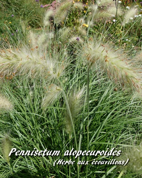 Son nom générique, du grec "alopoka" (renard) et "oura" (queue), fait allusion à la forme de ses inflorescences. Son origine géographique lui vaut son nom vernaculaire de "Pennisète chinois", sa forme celui d' "Herbe fontaine".
