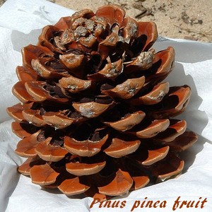 Son fruit est un cône trapu de 10 à 12 centimètres de long contenant beaucoup de résine qui s'ouvre la 3° année, libérant les graines noires ailées qui contiennent les amandes comestibles appelées pignons.