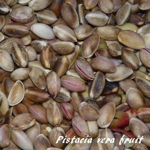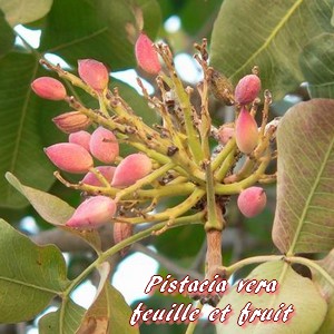 Ses fruits, disposés en grappes, sont des drupes de couleur verte à rouge dont le noyau déhiscent allongé contient une amande fort appréciée, la pistache.