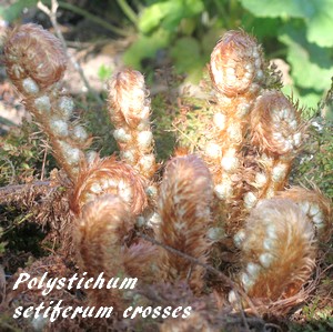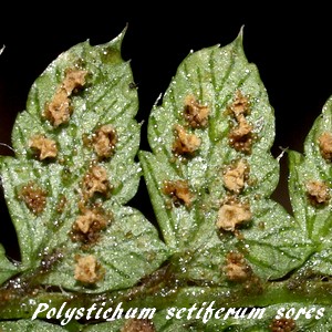 Son nom spécifique vient du latin "seta" (poil, crin, soie) et "fera" (qui porte), allusion aux poils sur ses frondes, ce qui lui vaut ses noms vernaculaires "Aspidie à cils raides" ou "Polystic à frondes soyeuses".