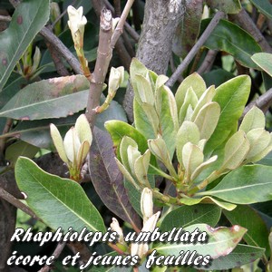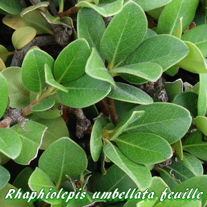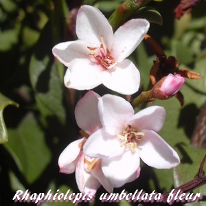 Le Rhaphiolepis umbellata (Rhaphiolépis à fleurs en ombelle) s'appelait auparavant Rhaphiolepis japonica, du nom du pays dont il est originaire.