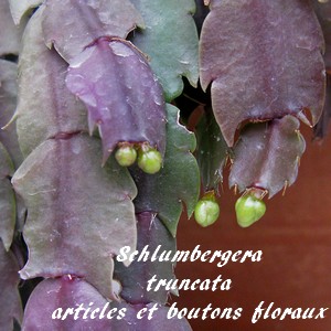 Schlumbergera truncata n'a ni épines ni feuilles. Ses tiges plus ou moins ramifiées sont d'abord dressées, puis retombantes. Elles sont formées de segments aplatis et allongés appelés