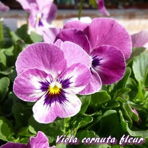 La Violette cornue sauvage (appelée ainsi pour l'éperon porté par ses fleurs) a des fleurs de couleur mauve unie. Les croisements effectués avec d'autres violettes ont donné de multiples