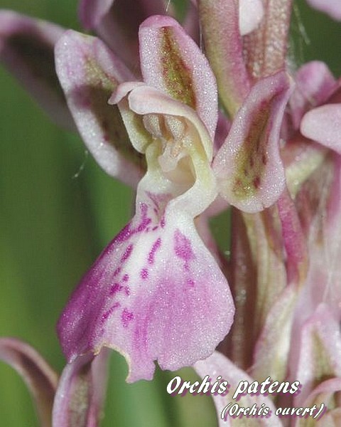 Orchis patens (Orchis ouvert) des fleurs plus classiques avec tous les tépales ouverts.