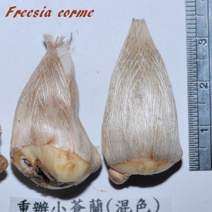 bulbes. Ces cormes, de taille modeste (1 à 2,5 centimètres de diamètre), ont une forme conique et sont recouverts d'une tunique fibreuse.