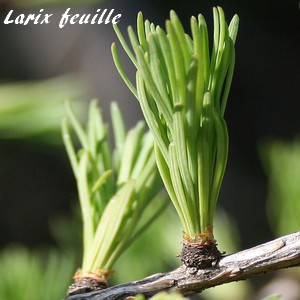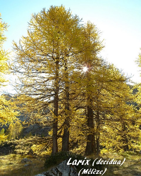 Le genre Larix (Mélèze) compte une douzaine d'espèces végétales appartenant à la famille des Pinacées originaires des régions tempérées d'altitude de l'hémisphère nord, en Europe particulièrement dans les Alpes et les Carpates, au Japon ou en Amérique du nord.